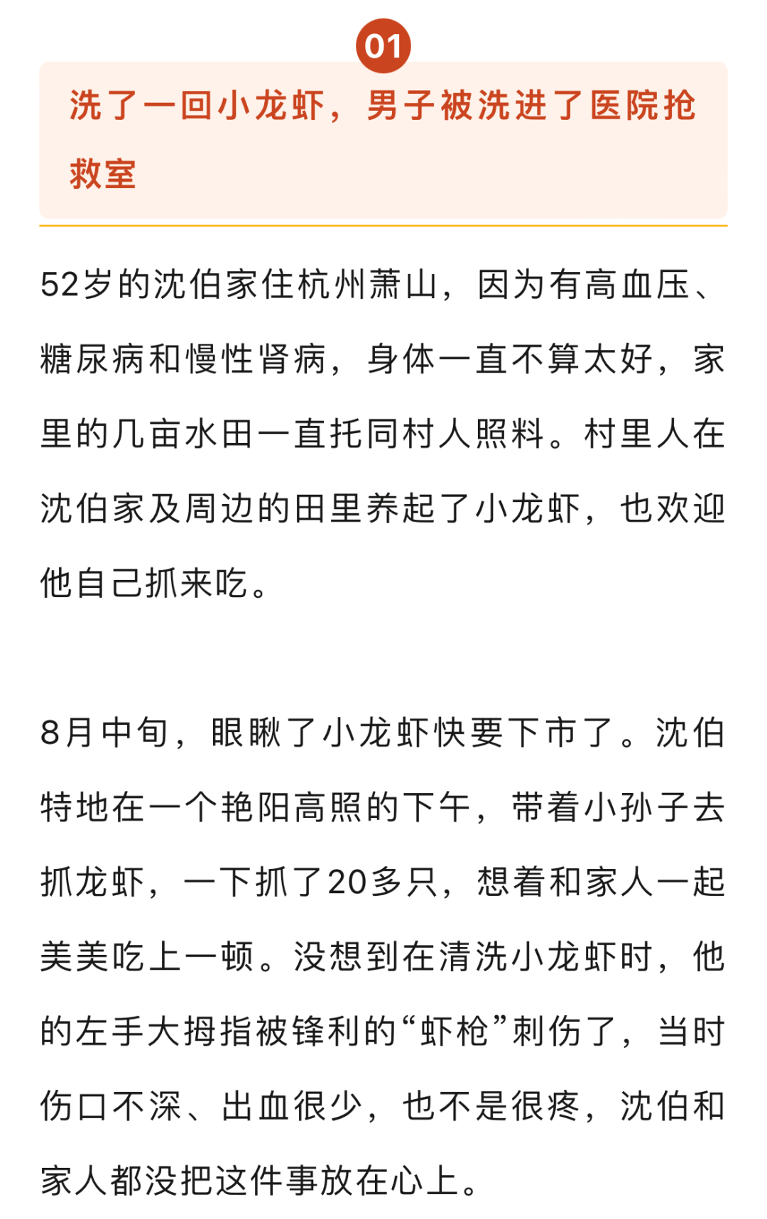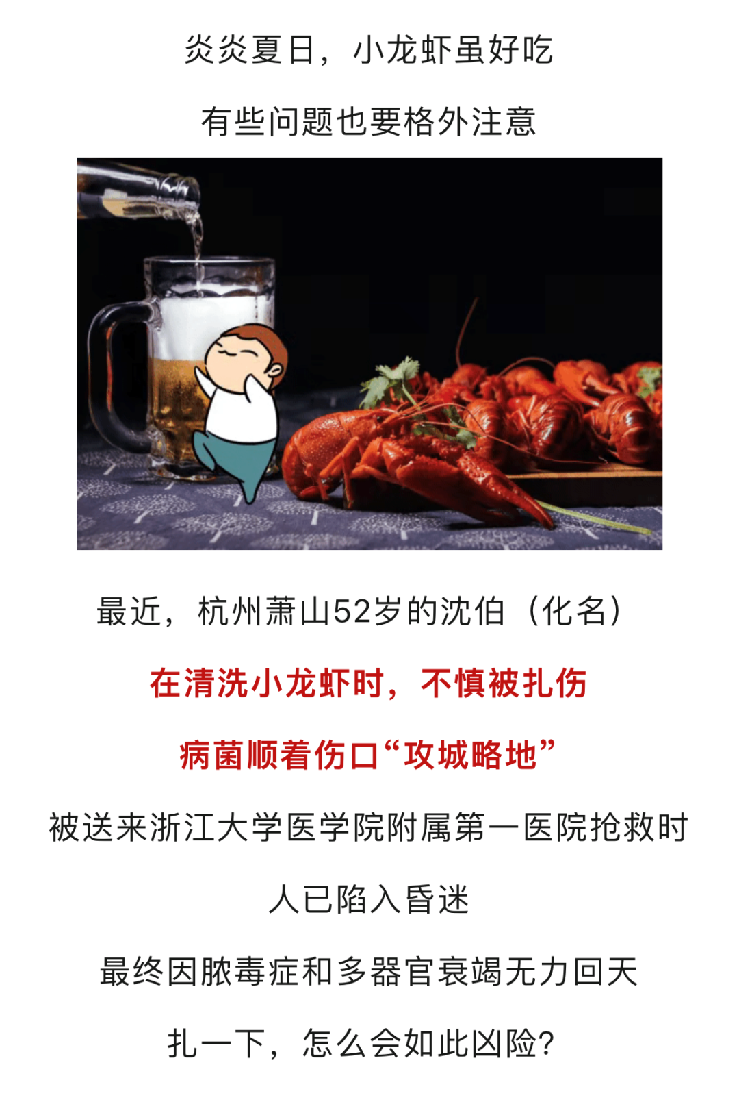 在處理小龍蝦、海鮮等時要特別小心,尤其是患有基礎性疾病或自身免疫功能較差的人,清洗處理食材時要盡量戴上防水厚手套,或借助尖刀、鉗子等工具防止被刺傷;