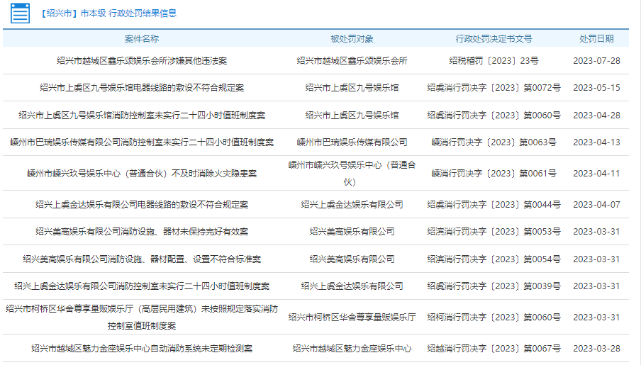 今年以來(lái),浙江政務(wù)服務(wù)網(wǎng)上公布了紹興多家?jiàn)蕵?lè)場(chǎng)所處罰情況,大部分為消防設(shè)施不符合標(biāo)準(zhǔn),其中包括不及時(shí)消除火災(zāi)隱患等。如嵊州市嵊興玖號(hào)娛樂(lè)中心(普通合伙)不及時(shí)消除火災(zāi)隱患案,嵊州市消防救援大隊(duì)查明,該娛樂(lè)中心存在消防控制室未實(shí)行二十四小時(shí)值班制度,違反了《浙江省消防條例》第三十六條第二款的規(guī)定,依據(jù)《浙江省消防救援機(jī)構(gòu)行政處罰裁量基準(zhǔn)(四)》第十項(xiàng)之規(guī)定,該行為屬于一般違法情形,又因?yàn)樵搯挝灰荒陜?nèi)因同一種違法行為受到兩次以上消防行政處罰,依據(jù)《浙江省消防行政處罰裁量規(guī)定》第九條規(guī)定,屬于從重處罰情形。根據(jù)《浙江省消防條例》第六十六條,決定給予嵊州市嵊興玖號(hào)娛樂(lè)中心(普通合伙)罰款人民幣柒仟元元整的處罰。