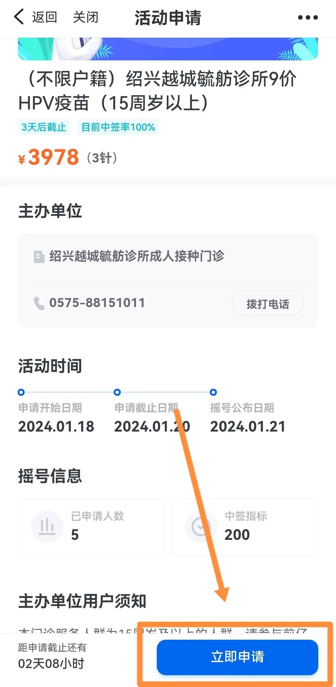 此次搖號(hào)不限戶籍!本疫苗廠家為進(jìn)口默沙東,接種時(shí)間為1月25日周四下午1:00—3:30(時(shí)間不可更改),如該時(shí)間不能前來(lái)打針的(名額不予保留),請(qǐng)勿參與此次搖號(hào)!!!預(yù)約成功者請(qǐng)按時(shí)來(lái)院接種(預(yù)約一次包含三針),接種請(qǐng)隨帶本人身份證原件、有醫(yī)保的請(qǐng)帶上醫(yī)??ɑ蛘唠娮俞t(yī)保憑證 。18周歲以下的未成年人必須要有家長(zhǎng)陪同。