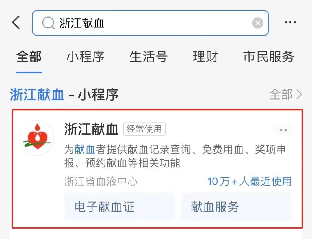 1.支付寶搜索“浙江獻(xiàn)血”;