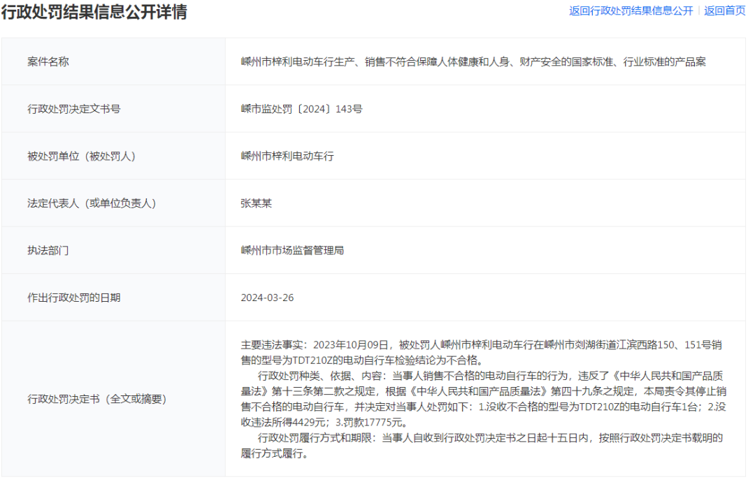 主要違法事實(shí):2023年10月09日,被處罰人嵊州市梓利電動(dòng)車行在嵊州市剡湖街道江濱西路150、151號(hào)銷售的型號(hào)為TDT210的電動(dòng)自行車檢驗(yàn)結(jié)論為不合格。