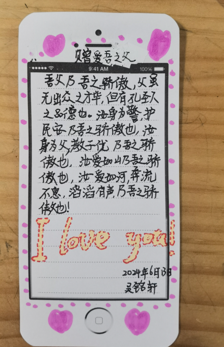 記憶中你總是很忙,早出晚歸,媽媽說你工作太辛苦,常顧不上家?,F(xiàn)在我長大了,我有再次選擇的機會,可是我和你一樣,也選擇了成為一名警察。我想說,你不僅是我的人生導(dǎo)師,現(xiàn)在也是我并肩前行的戰(zhàn)友,祝你父親節(jié)快樂。