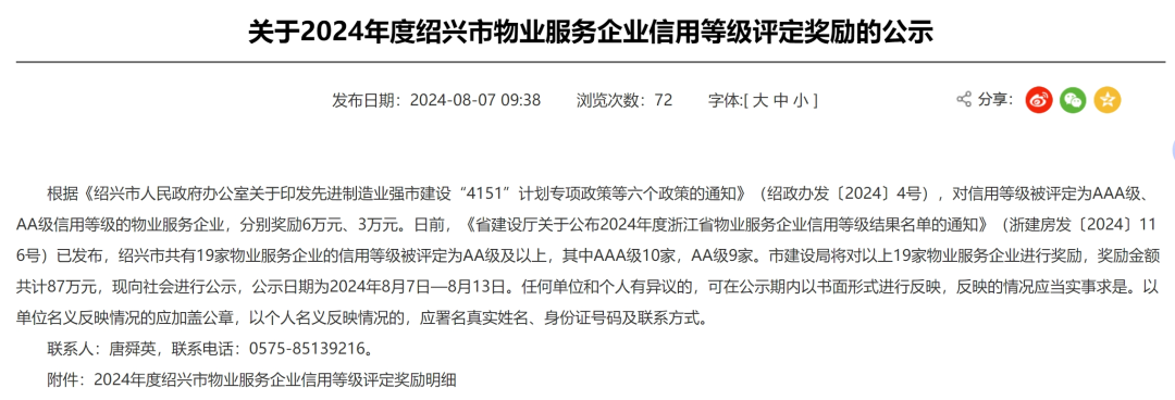 附件:2024年度紹興市物業(yè)服務(wù)企業(yè)信用等級評定獎勵明細(xì)