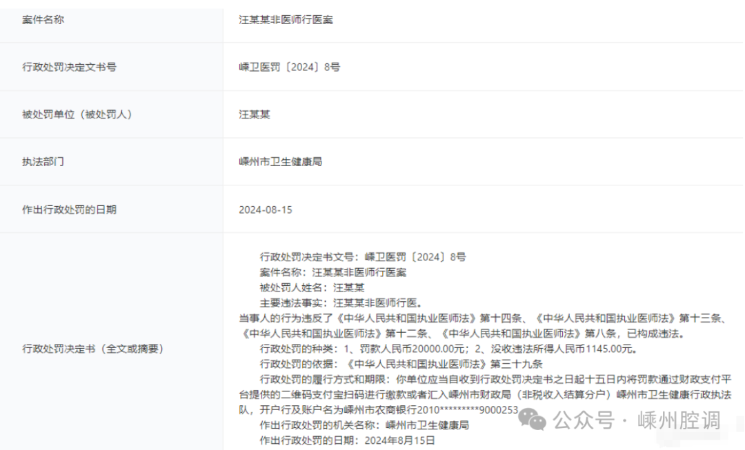 近日,浙江政務(wù)服務(wù)網(wǎng)公開(kāi)一則行政處罰,關(guān)于汪某某非醫(yī)師行醫(yī)案,以下是案件詳細(xì)內(nèi)容: