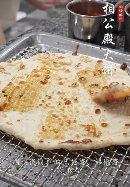 制作大餅的步驟十分樸素。將發(fā)好的面餅用搟面杖搟成薄薄一張,攤于火候適宜的平底鍋上,撒上些許蔥花、白芝麻,等面皮稍稍有些膨脹后再翻面,直至烤熟。手藝成熟的面餅師傅僅需以手按壓餅邊,感知彈性,就可斷其熟否。隨后起鍋,刷上咸醬或是辣椒醬,再添上一兩根酥脆的油條,香脆大餅,新鮮出爐。