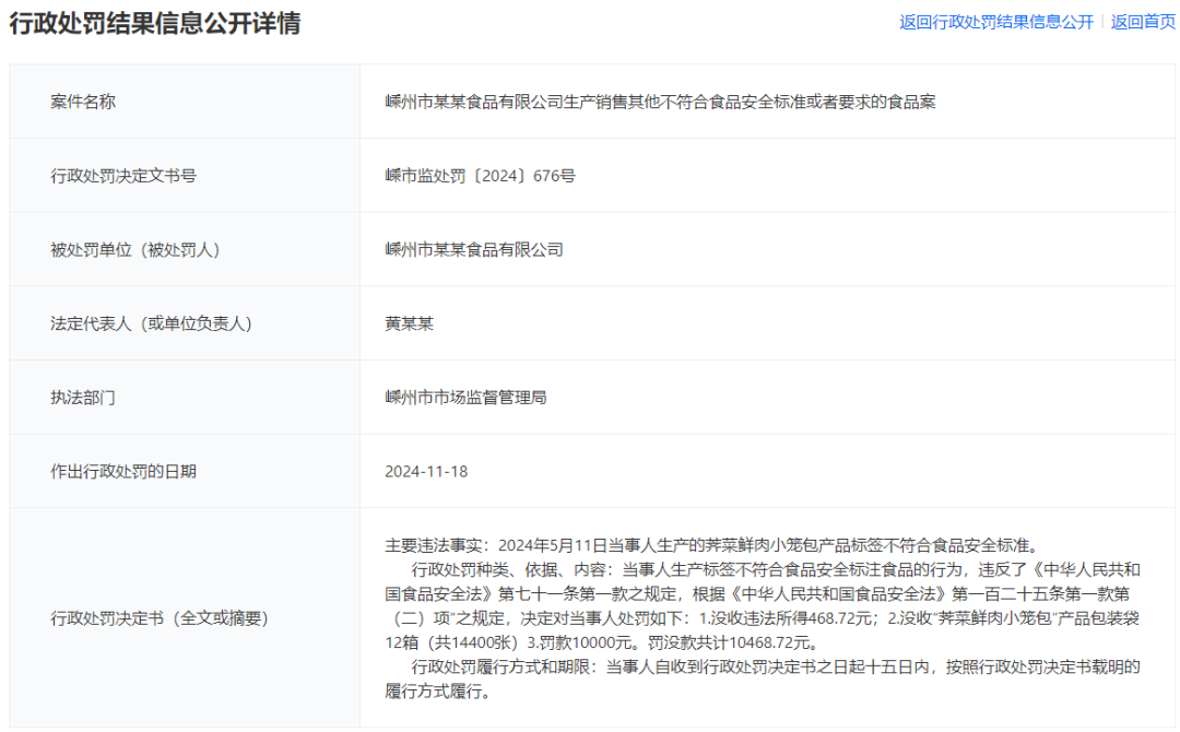 2024年5月11日當(dāng)事人生產(chǎn)的薺菜鮮肉小籠包產(chǎn)品標(biāo)簽不符合食品安全標(biāo)準(zhǔn)。