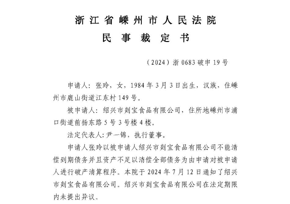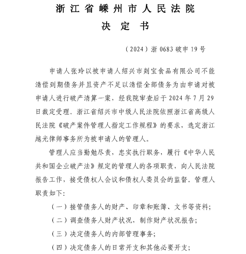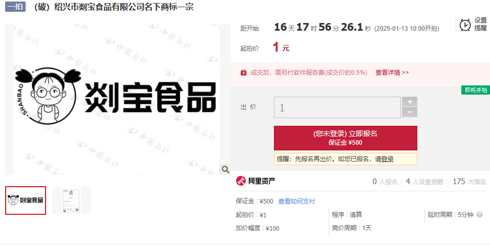 紹興市剡寶食品有限公司管理人將于2025年1月13日10時(shí)起至2025年1月14日10時(shí)止(延時(shí)除外)在淘寶網(wǎng)阿里拍賣破產(chǎn)強(qiáng)清平臺(tái)(處置單位:紹興市剡寶食品有限公司管理人,監(jiān)督單位:嵊州市人民法院,網(wǎng)址: