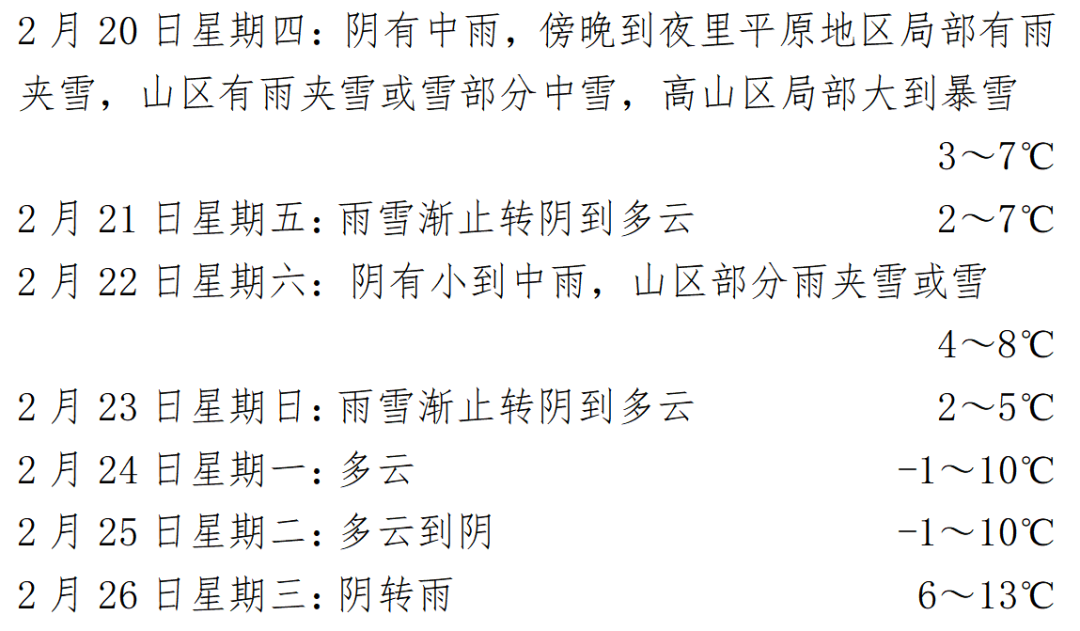 另外20至23日我市日平均氣溫在5~7℃之間,最低氣溫2~4℃、部分山區(qū)0~-2℃。