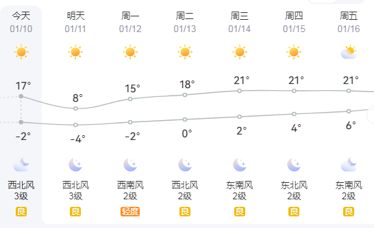 令人開(kāi)心的是,下周二(1月13日)起就要迎來(lái)一波明顯回暖,最高將會(huì)攀升至20℃左右,最低也將逐漸升至5℃以上。
