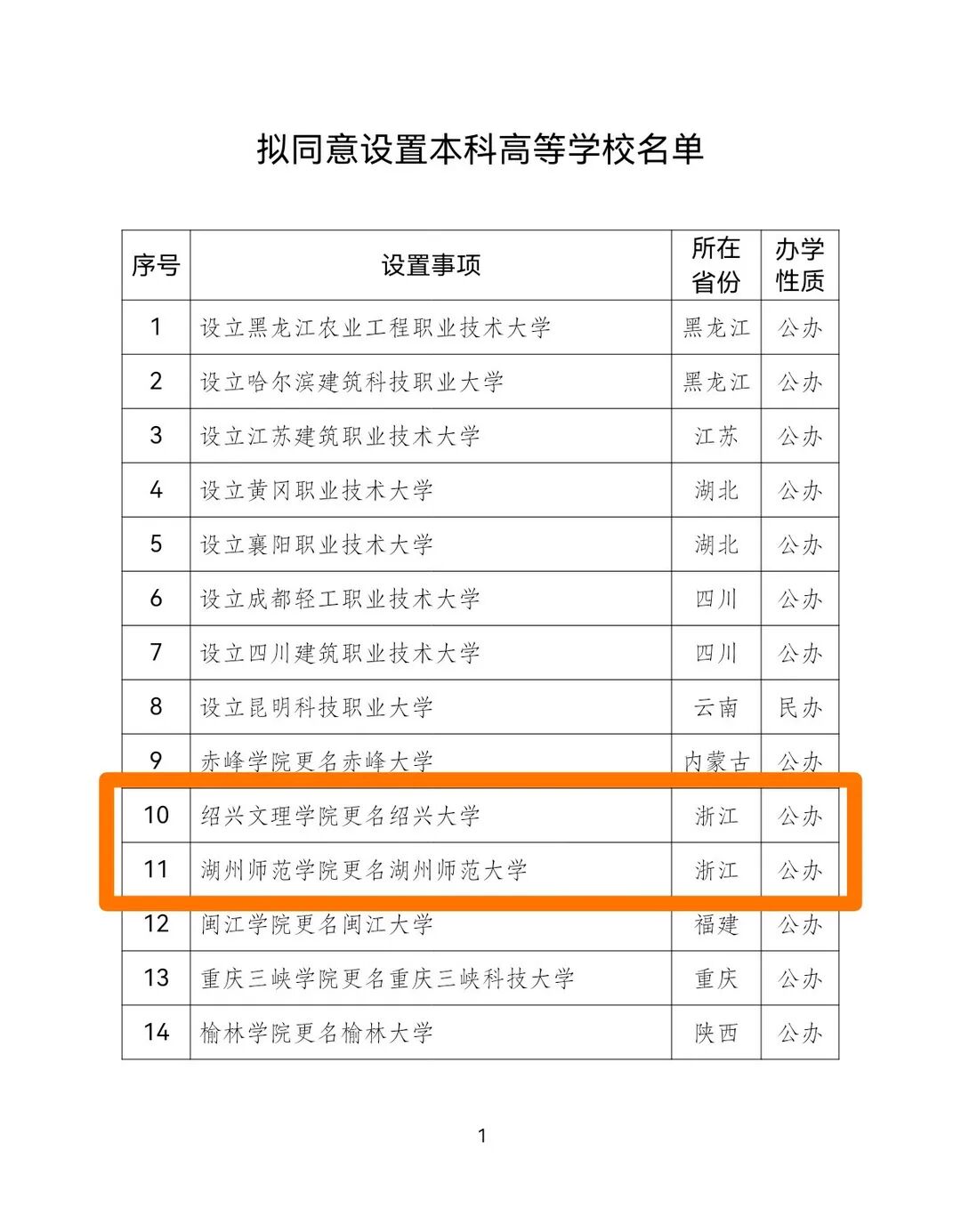 1月12日,教育部官網(wǎng)發(fā)布了《關(guān)于擬同意設(shè)置本科高等學(xué)校的公示》,擬同意設(shè)置黑龍江農(nóng)業(yè)工程職業(yè)技術(shù)大學(xué)等14所學(xué)校,其中紹興文理學(xué)院更名為紹興大學(xué)、湖州師范學(xué)院更名為湖州師范大學(xué)。