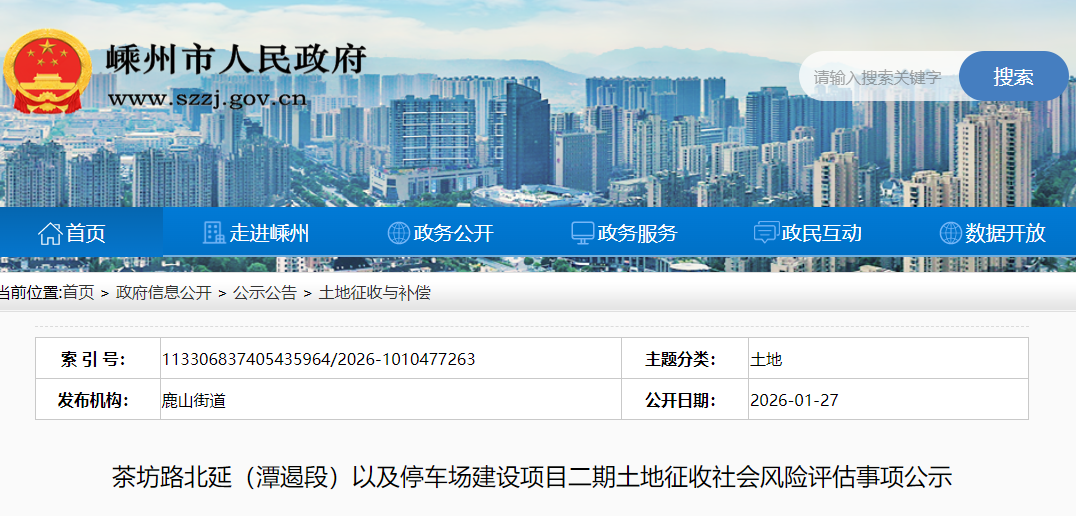 社會風(fēng)險評估事項公示 依據(jù)《關(guān)于印發(fā)嵊州市重大決策社會風(fēng)險評估實施細(xì)則的通知》(嵊市委辦發(fā)[2020]17號)精神,經(jīng)請示有關(guān)部門同意,現(xiàn)對“茶坊路北延(潭遏段)以及停車場建設(shè)項目二期土地征收”進行社會風(fēng)險評估,現(xiàn)將有關(guān)情況予以公示,征詢公眾對該項目的意見。 一、征收范圍 征收鹿山街道碧溪村農(nóng)民集體所有土地0.4309公頃(具體以勘測定界成果為準(zhǔn)); 二、征求公眾意見范圍及內(nèi)容 1、征求公眾意見范圍:關(guān)于本次土地征收涉及利益的相關(guān)群體為主。 2、征求公眾意見主要內(nèi)容: (1)該事項是否影響公共利益,有何訴求; (2)該事項對當(dāng)?shù)厣鐣€(wěn)定是否會產(chǎn)生風(fēng)險,如有,主要注意哪些方面; (3)對該事項持有何種態(tài)度; (4)對該事項有何意見和建議; (5)非社會風(fēng)險方面相關(guān)內(nèi)容不在本次公眾參與征求意見范圍。 三、聯(lián)系方式 評估責(zé)任主體:嵊州市鹿山街道辦事處 評估單位:嵊州市剡誠風(fēng)險評估有限公司 聯(lián)系人:應(yīng)女士 15967586124 電子郵箱:3529589615@qq.com 四、公示說明 公示期間,公眾可通過書面意見、電子郵件、電話等方式與項目單位或社會風(fēng)險評估單位聯(lián)系,表達對本決策事項風(fēng)險評估工作的意見和建議。 公示有效期:自公示之日起七個自然日。 嵊州市鹿山街道辦事處 2026年1月27日