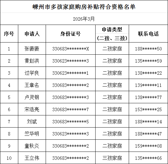 根據(jù)《嵊州市多孩家庭購房補貼實施細則》文件精神,2026年2月26日至2026年3月25日,通過審核符合資格多孩家庭共10戶,當前剩余補貼額度1.0985萬元,現(xiàn)將名單進行公布。