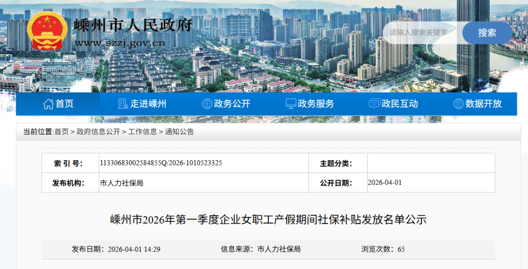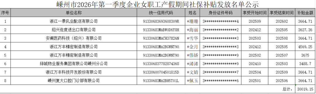 近日,嵊州市人民政府網(wǎng)發(fā)布一則《嵊州市2026年第一季度企業(yè)女職工產(chǎn)假期間社保補(bǔ)貼發(fā)放名單公示》,具體內(nèi)容如下: