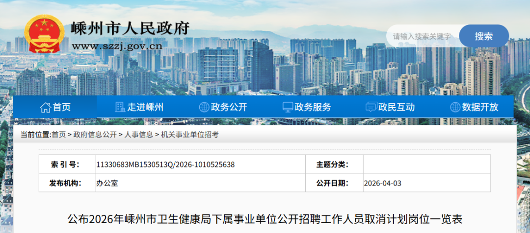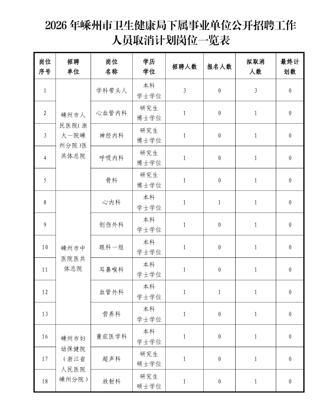 公布2026年嵊州市衛(wèi)生健康局下屬事業(yè)單位公開招聘工作人員取消計(jì)劃崗位一覽表