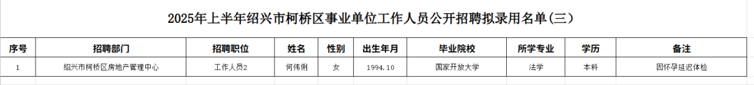 2025年上半年紹興市柯橋區(qū)事業(yè)單位工作人員公開招聘擬錄用名單(三)