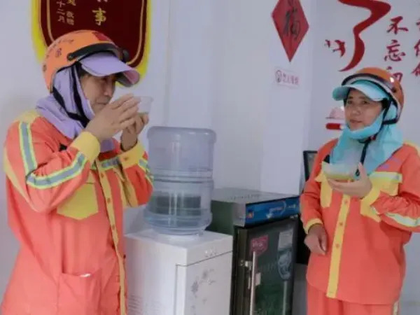 累了、熱了,這里的冷飲補給隨取隨用,自浦口街道桃源社區(qū)全面啟動清涼公益行活動后,附近的戶外工作者隨時可以到桃源社區(qū)休息、喝茶、喝飲料,在工作之余有一個休憩場所?! ∽蛉丈衔纾?位剛掃完地的環(huán)衛(wèi)工人來到